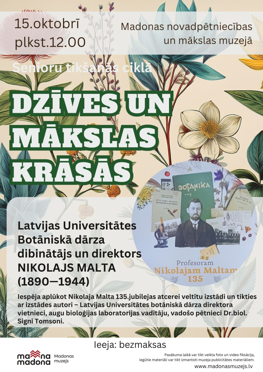 15. oktobrī plkst.12.00 aicinām pasākumu senioru tikšanās ciklā. Šajā tikšanās reizē iepazīsim botānikas profesora, Latvijas Universitātes Botāniskā dārza dibinātāju un pirmo direktoru Nikolaja Maltas (1890—1944). Iespēja aplūkot