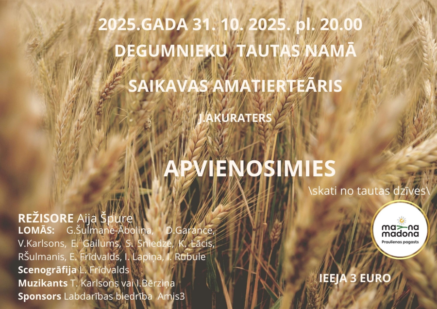 Ieejas maksa - 3 EUR.Informāciju iesūtīja: Degumnieku tautas nama vadītāja Ilze Melngaile, tālr.: +371 25622223.