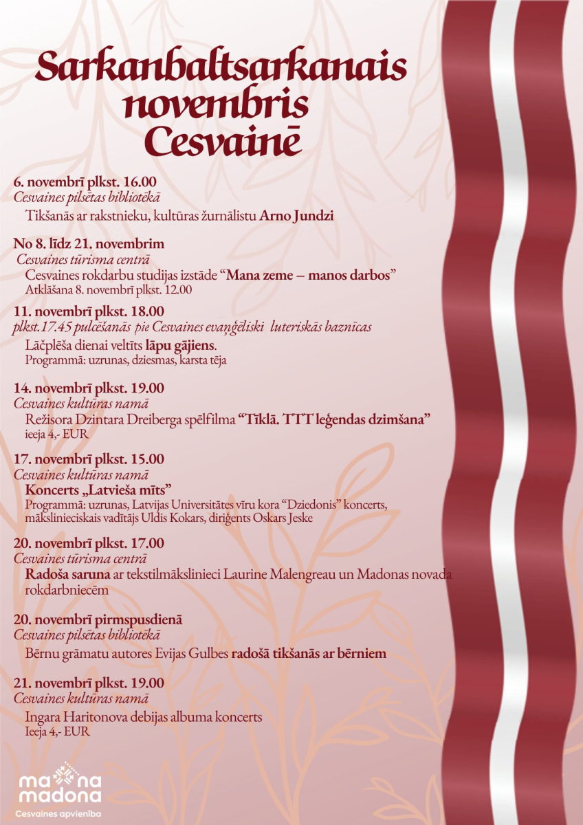 Pasākumu ciklu atklās tikšanās ar rakstnieku un kultūras žurnālistu Arno Jundzi, savukārt, Cesvaines rokdarbu studijas izstāde “Mana zeme – manos darbos” priecēs ar radošu skatījumu uz Latviju. Lāčplēša dienā notiks lāpu gājiens, bet valsts svētku noskaņās Cesvaines kultūras nams piedāvās koncertu “Latvieša mīts” ar Latvijas Universitātes vīru kori “Dziedonis”.