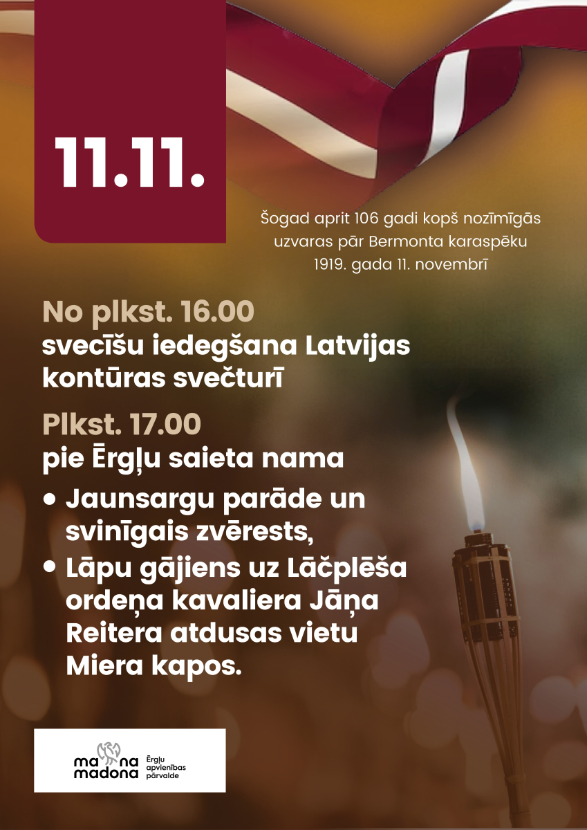 Ērgļos šajā dienā pieminam divus Lāčplēša ordeņa kavalierus Pēteri Bērziņu, kura atdusas vieta ir Sauleskalna kapos, un Jāni Reiteru, kuram ziedus nesam uz Miera kapiem.
