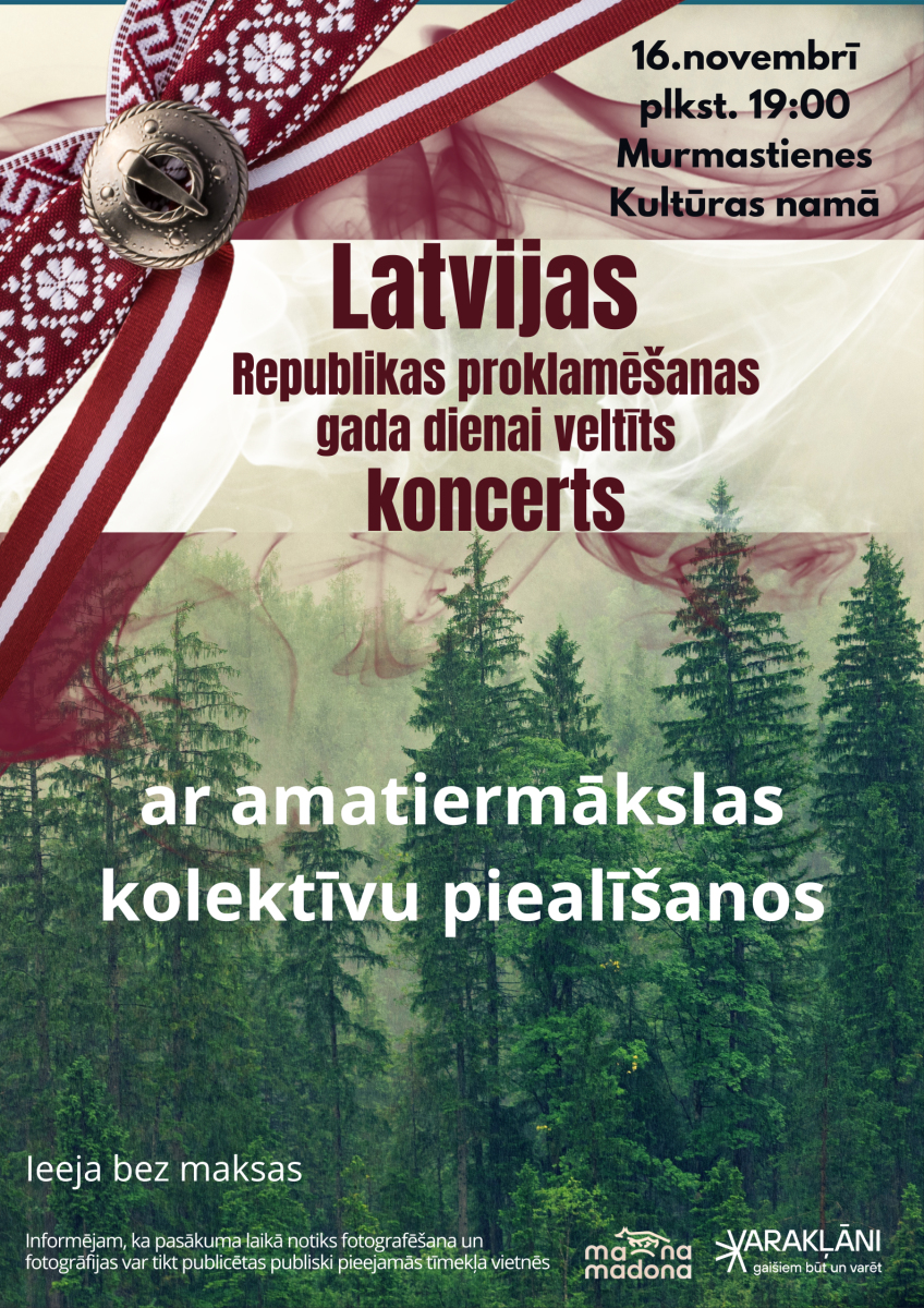 Par godu Latvijas Republikas proklamēšanas gada dienai veltīts koncerts, kurā uzstāsies Murmastienes kultūras nama amatiermākslas kolektīvi.