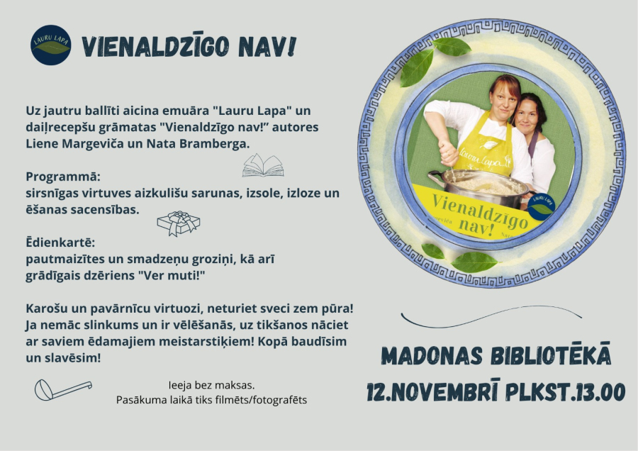 12. novembrī plkst.13.00 Madonas novada bibliotēkā aicinām uz tikšanos ar recepšu grāmatas un bloga autorēm Lieni Margeviču un Natu Brambergu.