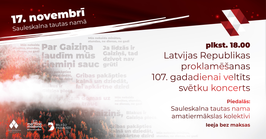 17. novembrī uz Latvijas Republikas proklamēšanas 107. gadadienai veltītu svētku koncertu ielūdz Sauleskalna tautas nama amatiermākslas kolektīvi.