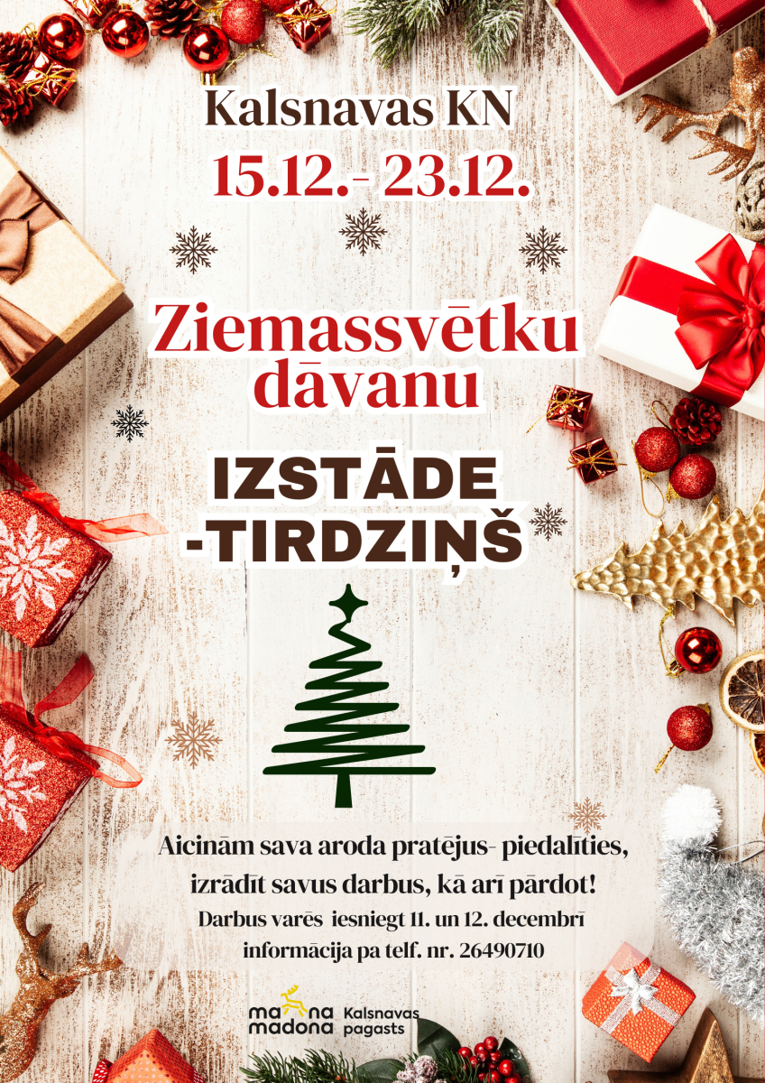 Ienāc burvīgā svētku pasaulē! Šogad mūsu Ziemassvētku dāvanu izstāde - tirdziņš piedāvās ne tikai daudzveidīgas un oriģinālas dāvanu idejas, bet arī sirsnīgu svētku gaisotni, kas piepildīs mūsu sirdis ar Ziemassvētku brīnumu.