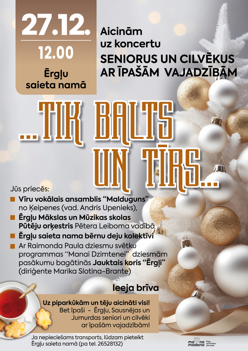 27. decembrī plkst. 12.00 Ērgļu saieta namā Ērgļu apvienības seniori tiek aicināti uz koncertu "TIK TĪRS UN BALTS…”.