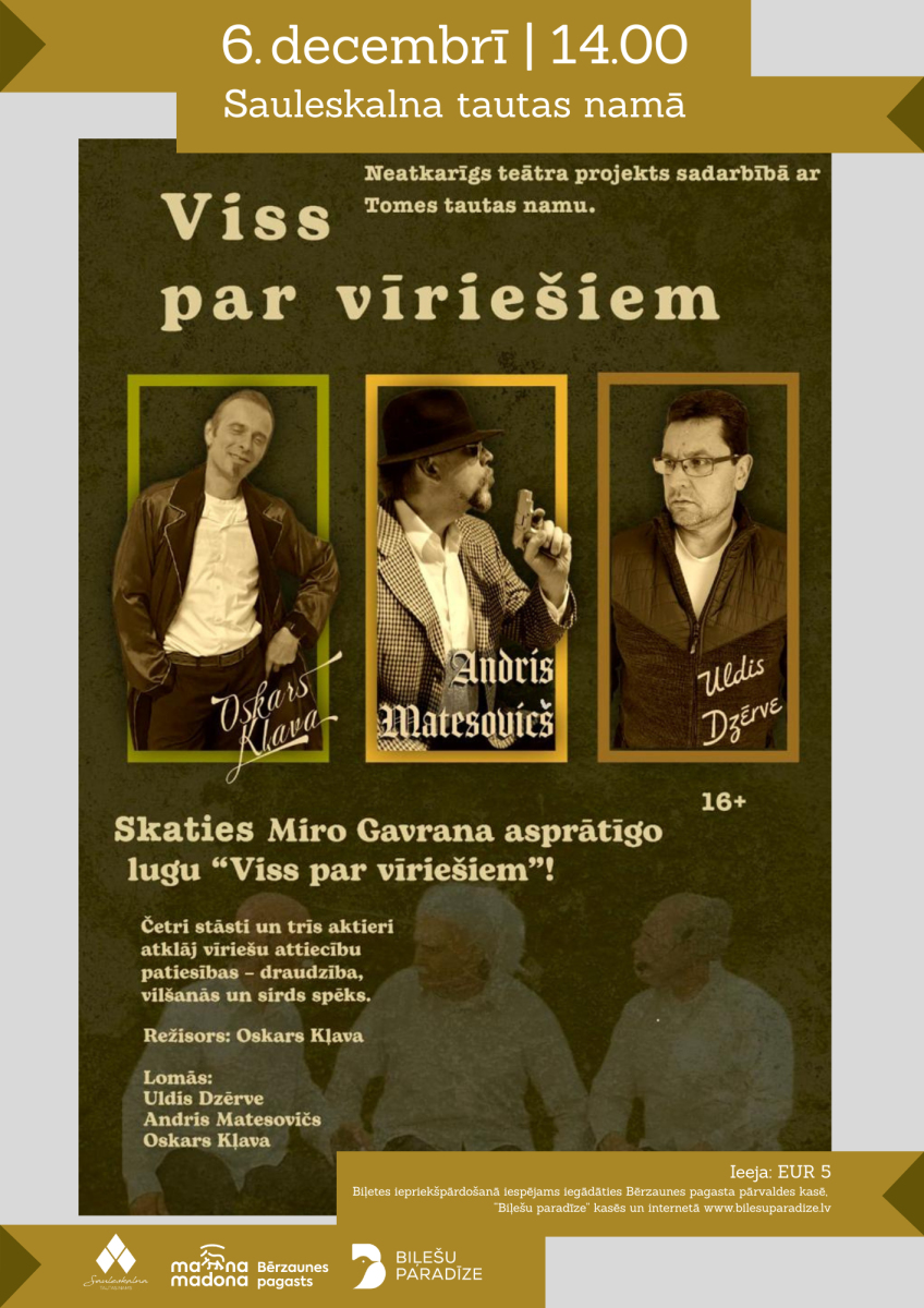 Ko mēs patiesībā zinām par vīriešiem? Kā aiz ārējiem jokiem, rutīnas un klusuma dzīvo neīstenoti sapņi, vilšanās un ilgas pēc tuvības? Skatītāju uzmanībai piedāvājam asprātīgu, aizkustinošu un vienlaikus provokatīvu Miro Gavrana