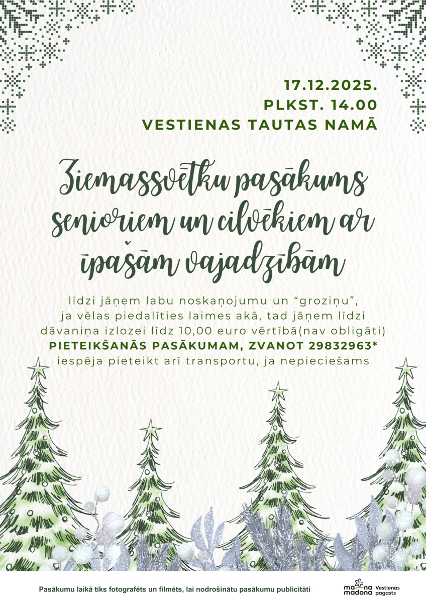17. decembrī plkst. 14.00 Vestienas tautas nams aicina seniorus un cilvēkus ar īpašām vajadzībām uz sirsnīgu un gaišu Ziemassvētku pasākumu. Tā būs iespēja baudīt kopā būšanu, svētku atmosfēru un jauku pēcpusdienu draudzīgā gaisotn