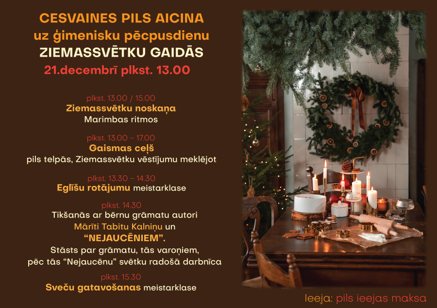 Svētku priekšvakarā ikviens interesants ielūgts baudīt Ziemassvētku noskaņas Cesvaines pilī. Apmeklētāji varēs piedalīties radošās meistarklasēs, kurās būs iespējams izgatavot eglīšu rotājumus un svecītes. Sekojot gaismas ceļam pils telpās, aicināsim ikvienu iesaistīties aktivitātē, lai nonāktu pie vēstījuma Ziemassvētku tematikā. Mazākus un lielākus apmeklētājus sagaidīs Ziemassvētku vecītis, kurš uzklausīs gada laikā paveiktos darbus un nedarbus.