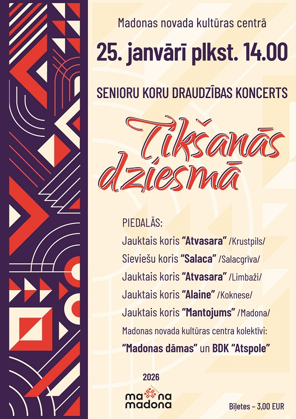 Ieejas maksa - 3 EUR, biļetes iegādājamas stundu pirms koncerta Madonas novada kultūras centrā.