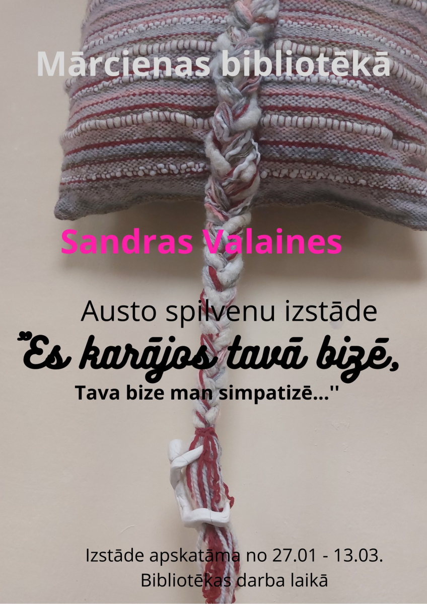 Izstāde skatāma bibliotēkas darba laikā. Februārī māksliniece apsolīja ar sava talanta pielūdzējiem sarunu “Par sapņiem, notikumiem un aušanu”. Sandra atjaunoja savas vecmammas stelles un aizrāva ar aušanu visu TDA ”Lubāna“ dejotājas. Sandra ir radoša, enerģiska, daudzpusīga un interesanta, ekstravaganta, dzirkstoša māksliniece.