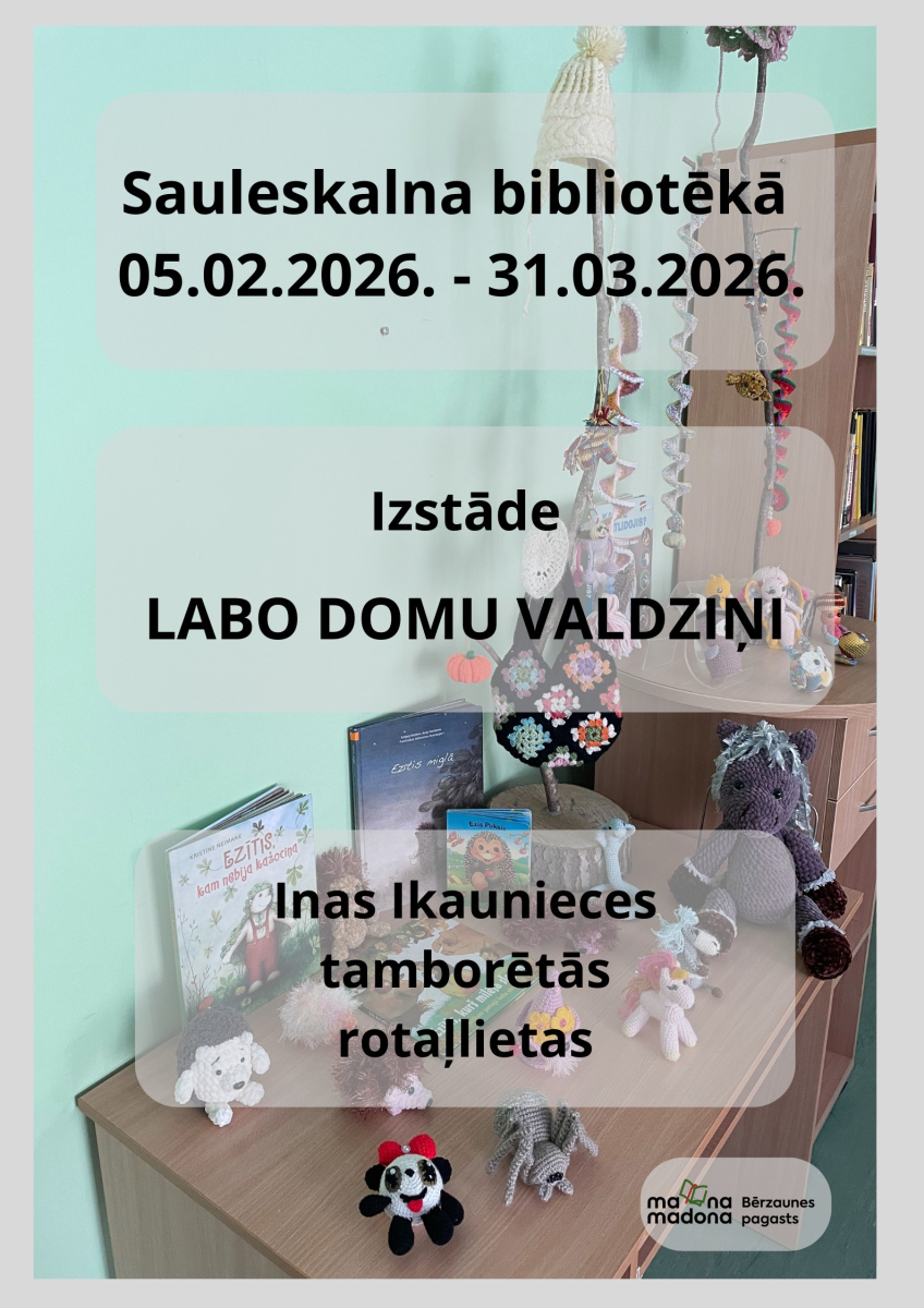 Bērzaunes pagasta bibliotēkā Sauleskalnā līdz 31.martam ir apskatāma Inas Ikaunieces tamborēto rotaļlietu izstāde.