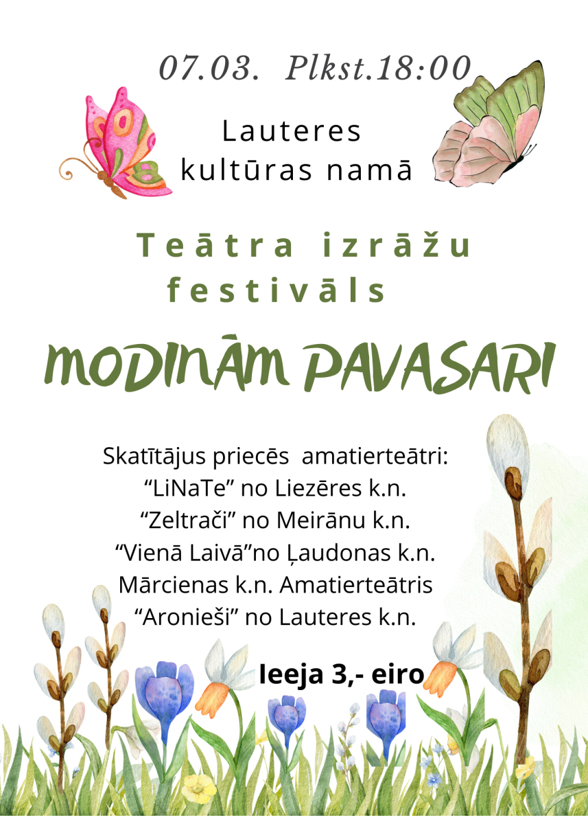 Amatierteātru izrāžu festivālā “Modinām pavasari” savas izrādes spēlēs pieci amatierteātru kolektīvi no Madonas novada. Katrs kolektīvs modinās pavasari sevī un apkārt ar teātri, ar sirdi, ar kopā būšanas prieku Pēc izrāžu beigām katrs kolektīvs saņems savu pagodinājuma nomināciju.