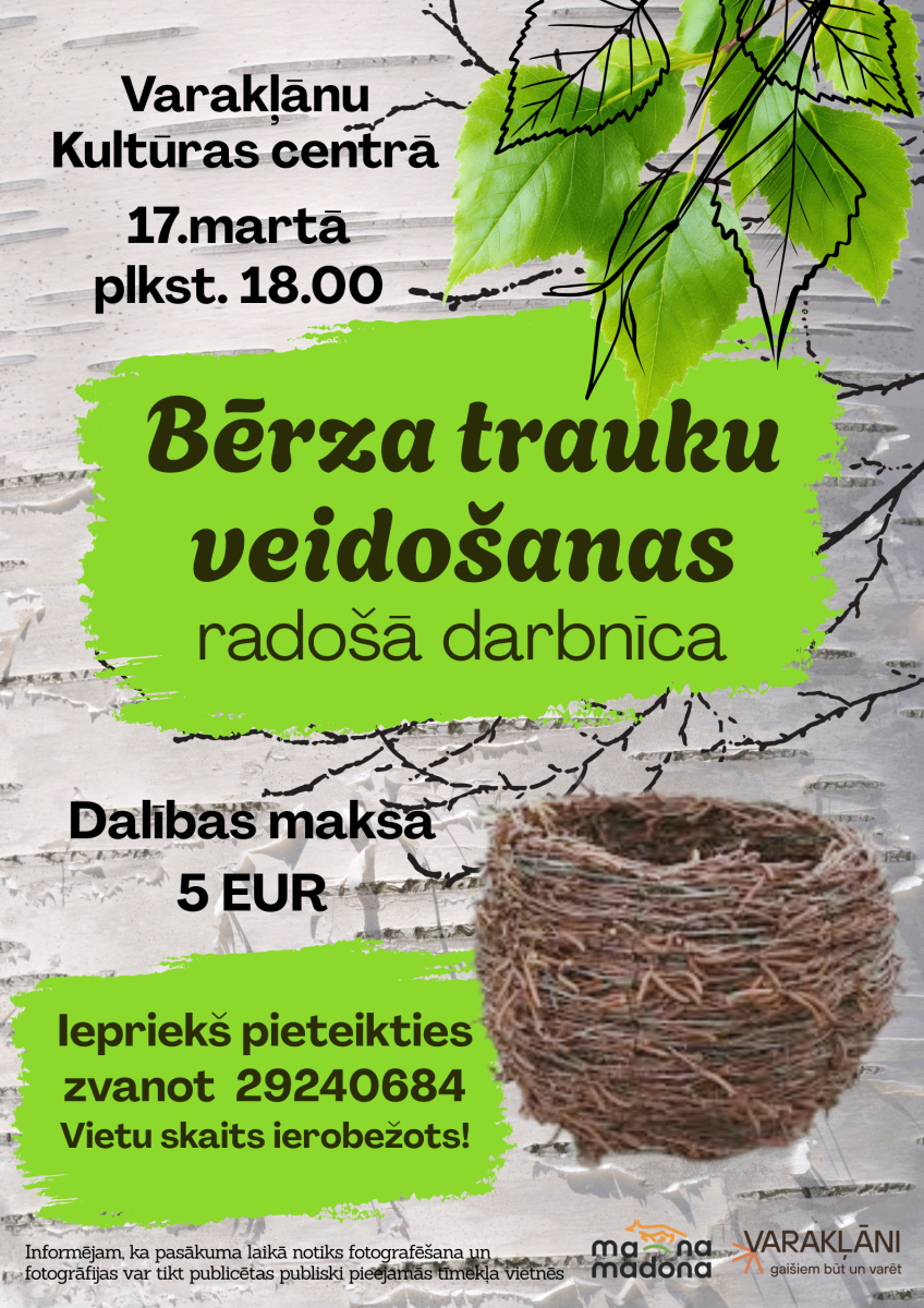 Darbnīcas laikā dalībniekiem būs iespēja iepazīt dabīgus materiālus un praktiski izmēģināt trauku veidošanu no bērza zariem. Pasākums paredzēts ikvienam interesentam, kurš vēlas radoši darboties un apgūt jaunas prasmes.