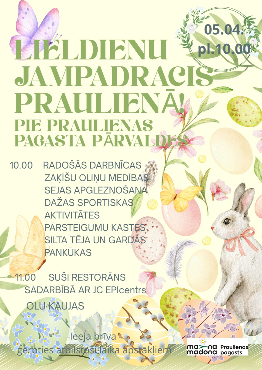 Nāciet visi - mazi un lieli- uz jautru un krāsainu Lieldienu jampadraci Praulienā! Līdzi - smaidu un labu garastāvokli.