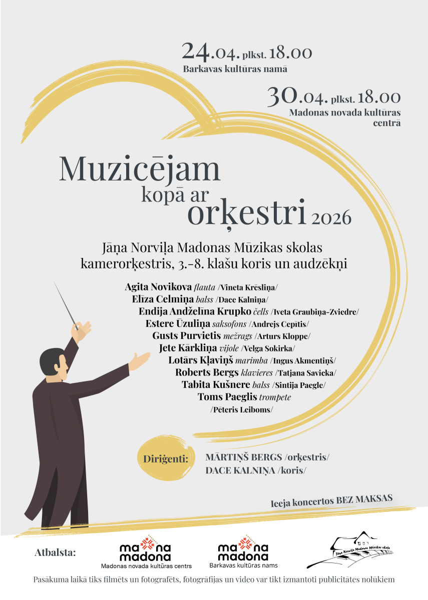 Ceturtdien, 2026. gada 30. aprīlī, Madonas novada kultūras centrā plkst. 18.00 notiks Jāņa Norviļa Madonas mūzikas skolas kamerorķestra koncerts Muzicējam kopā ar orķestri (diriģents – Mārtiņš Bergs)