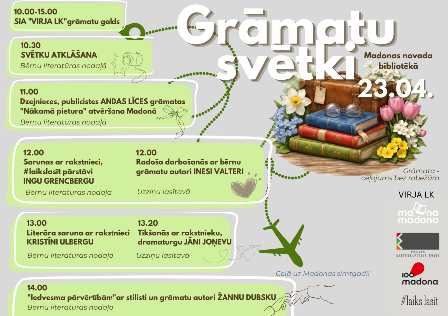 23. aprīlī Madonas novada bibliotēkā norisināsies īpaši Grāmatu svētki, kas pulcēs literatūras cienītājus, autorus un radošās personības visas dienas garumā. Pasākums piedāvā bagātīgu programmu gan bērniem, gan pieaugušajiem, aicinot iepazīt grāmatu pasauli kā nebeidzamu ceļojumu.