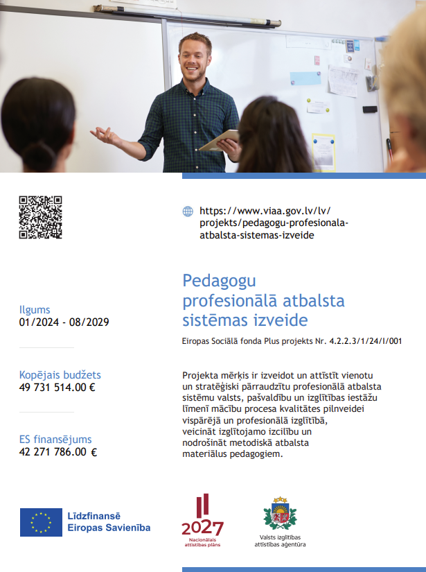 - Pašvaldības un valsts pārvaldes iestādes - atbildīgas par pedagogu profesionālās kompetences pilnveides koordinēšanu un īstenošanu, izglītības satura īstenošanu un pārraudzību, latviešu valodas apguves atbalsta nodrošināšanu, vispārējās un profesionālās izglītības kvalitātes novērtēšanu, kultūras un radošās industrijas izglītības politikas īstenošanu. Projekta īstenošana dos iespēju Valsts izglītības attīstības aģentūrai (turpmāk – VIAA) paaugstināt darbinieku un citu iesaistīto personu profesionālo kapacitāti un radīt jaunas paaudzes mācību satura dokumentus efektīvai mācību satura un pieejas īstenošanai, metodiskajam nodrošinājumam. Tiks stiprināta VIAA institucionālā kapacitāte, aprobētas jaunas formas pārmaiņu komunikācijai un ieviešanai, sadarbības un sociālo partneru iesaistei. Par latviešu valodas apguves atbalsta nodrošināšanu atbildīgā iestāde - Latviešu valodas aģentūra. Izglītības un zinātnes ministrija pildīs sadarbības partnera funkciju attiecībā uz digitālajām platformām – informācijas sistēmām, kur IZM saskaņā ar normatīvajos aktos noteikto ir šo sistēmu pārzinis. Valstspilsētu un novadu pašvaldības, īstenojot sadarbības partnera pienākumus, veido nozīmīgu projekta mērķgrupu vienotas un stratēģiski pārraudzītas profesionālā atbalsta sistēmas izveidei (t.sk. pašvaldību izglītības pārvaldes, to izglītības speciālisti).