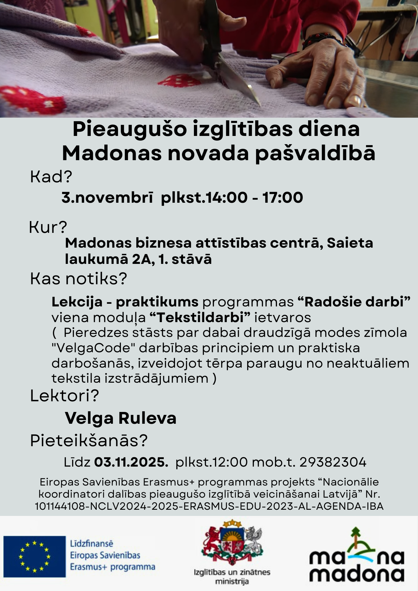 Madonas novada pašvaldība Eiropas Savienības Erasmus+ programmas projekta “Nacionālie koordinatori Eiropas programmas ieviešanai Latvijas pieaugušo izglītībā” (projekta numurs Nr. 101144108-NCLV2024-2025-ERASMUS-EDU-2023-AL-AGENDA-IBA) ietvaros aicina uz vienpadsmito pieaugušo izglītības dienu Madonas biznesa attīstības centrā, Saieta laukumā 2A, 1.stāva zālē, kur tiks realizēta programmas “Radošie darbi” viena moduļa lekcija “Tekstildarbi”.