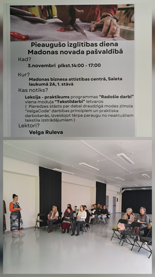“VelgaCode tērpu audzētava ciemojās Madonas novada pašvaldībā. Stāstīju par sevi, savu darbošanos un par dabai draudzīgo un nedraudzīgo modi, tās ietekmi dažādos līmeņos. Publika bija burvīga un atsaucīga. No Aizkraukles speciāli bija atbraukusi mana kolēģe Ilva Lejiņa, kura īpašā veidā apdrukā neaktuālu apģērbu, tādejādi piešķirot tam otru, pat daudz interesantāku dzīvi. Biju paņēmusi līdzi arī tērpus, lai dāmas var apskatīties un apčamdīt. Dažas arī iedvesmojās un ieguva tērpus savā īpašumā, jo arī madonietēm gribas valkāt oriģinālus, kā nevienai pasaulē tērpus. Man ļoti patika žiperīgā dāma no senioru biedrības(diemžēl neuzzināju vārdu), kurai ir, pēc viņas vārdiem, gandrīz astoņdesmit gadi, bet vēlme pucēties ir saglabājusies. Lepojos un priecājos, ka arī viņa valkās "VelgaCode" kleitu. Gaisotne bija jauka, priecīgu mirkļu pilna. Iedvesmojoši bija abām pusēm! Lai mums vairāk jēgpilnu un iedvesmojošu pasākumu! Paldies Jolantai par uzaicinājumu!”