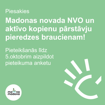 1. oktobrī ar pirmo nodarbību uzsākās Madonas novada pašvaldības NVO inkubācijas programma. Lai stiprinātu Madonas novada nevalstisko organizāciju (NVO) kapacitāti, attīstītu to rīcības spējas, iegūtu praktiskas zināšanas ilgtspējīgai darbībai un ideju realizēšanai, kā arī veidotu NVO atbalsta mehānismu, Madonas novada pašvaldība organizē NVO inkubācijas programmu, kurā iespējams atbalsts NVO izaugsmei un noteikto mērķu sasniegšanai caur apmācībām un konsultācijām no nozares ekspertiem.