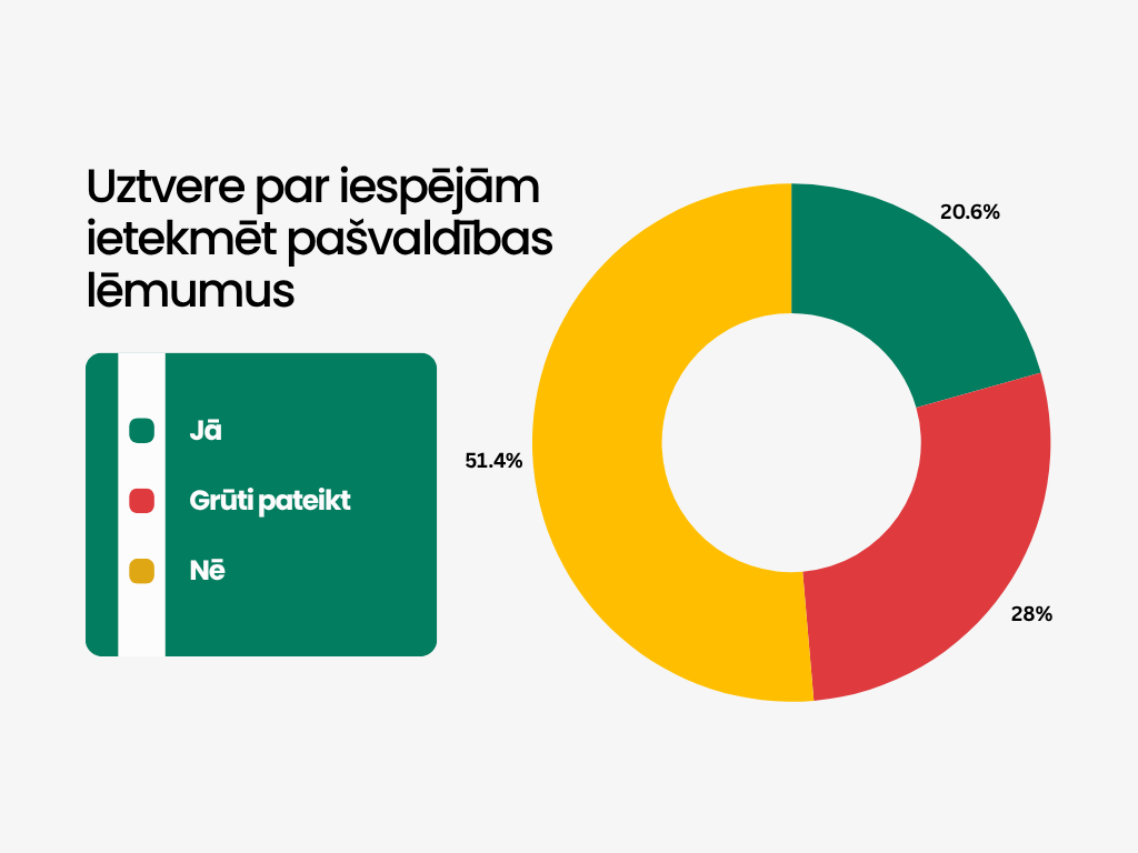 Lai gan vairāk nekā puse (51%) iedzīvotāju nejūtas iesaistīti pašvaldības lēmumu pieņemšanā, trešdaļa norāda, ka būtu gatavi piedalīties brīvprātīgās iniciatīvās, lai uzlabotu dzīvi novadā.