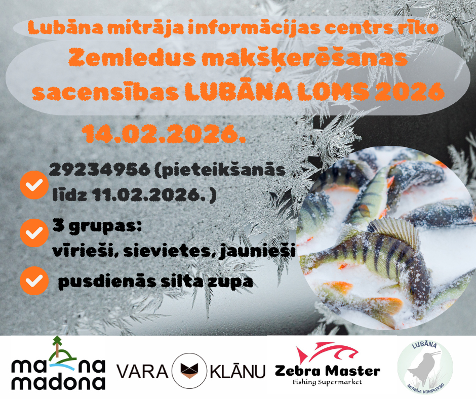 Lubāna ezerā, pie Lubāna mitrāja informācijas centra 2026.gada 14.februārī norisināsies zemledus makšķerēšanas sacensības "Lielais Lubāna loms 2026".