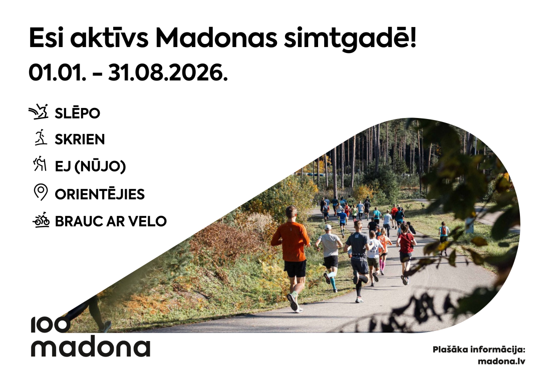 No 2026. gada 1. janvāra līdz 31. augustam Madonas novada pašvaldība aicina ikvienu – gan novada iedzīvotājus, gan ciemiņus – piedalīties kopīgā kustību izaicinājumā “Esi aktīvs Madonas simtgadē!”. Tā ir iespēja apvienot rūpes par veselību ar dalību Madonas simtgades notikumos – krājot savus kilometrus pastaigās, skrienot, slēpojot, braucot ar velosipēdu un meklējot orientēšanās kontrolpunktus.