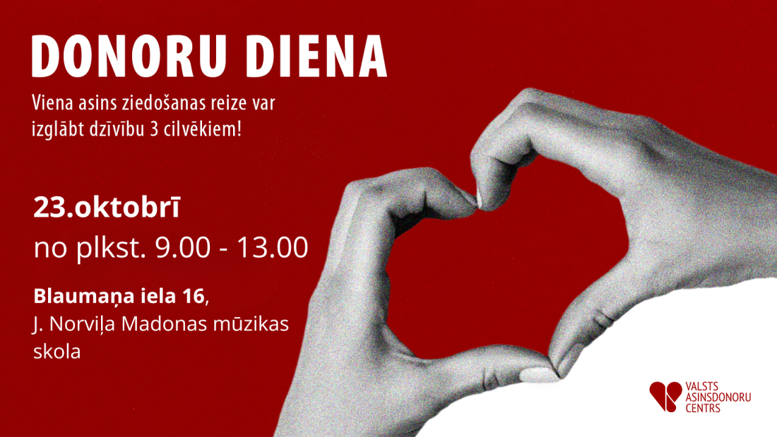 Valsts asins donoru centrs (VADC) rīko izbraukumu Jāņa Norviļa Madonas mūzikas skolā, Blaumaņa ielā 16, 23. OKTOBRĪ, no plkst. 09:00 līdz 13:00.