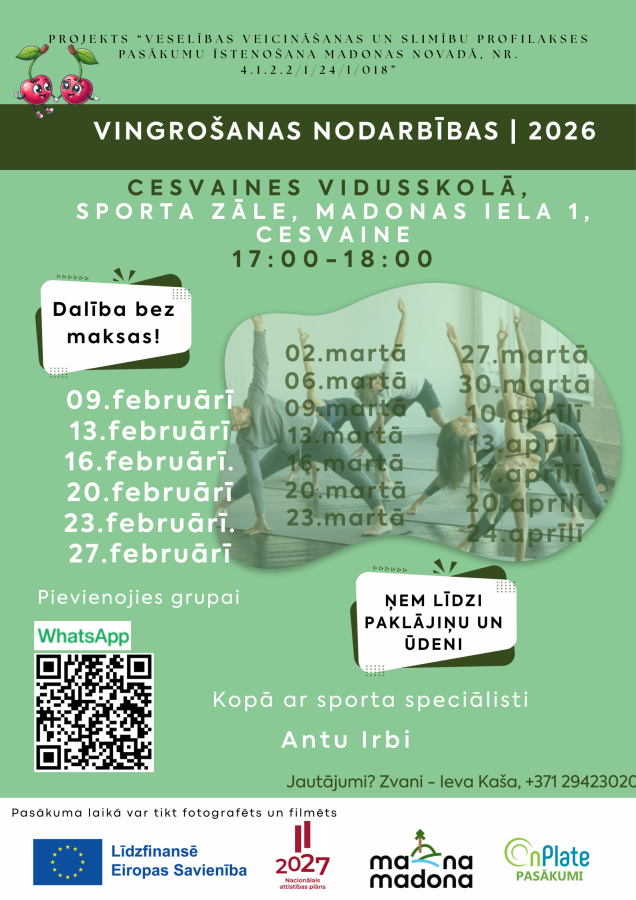 Nodarbības notiks regulāri pirmdienās un piektdienās plkst. 17:00-18:00, Cesvaines vidusskolas sporta zālē, Madonas ielā 1, Cesvainē, Madonas novads!