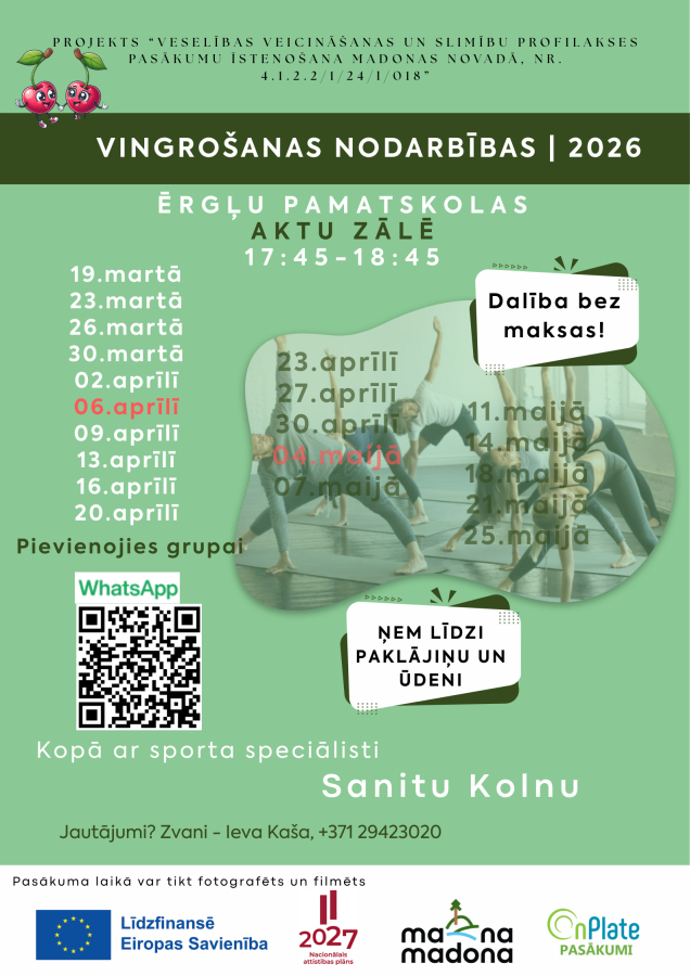 Projekta “Veselības veicināšanas un slimību profilakses pasākumu īstenošana Madonas novadā” ietvaros (projekta Nr. 4.1.2.2/1/24/I/018 sākot ar 19.martu, notiks bezmaksas vingrošanas nodarbības.