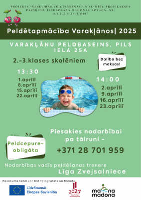 Kopā ar peldēšanas treneri Līgu Zvejsalnieci peldēšanas nodarbībās bērni apgūs drošību ūdenī, pareizu elpošanu un peldēšanas pamatus. Stiprināsim muskuļus, uzlabosim izturību un pārliecību par sevi. Regulāras nodarbības palīdz justies brīvi ūdenī, vairo enerģiju un prieku kustībā — lai vasaras piedzīvojumi būtu droši un jautri! Uz nodarbību jāņem līdzi peldcepure.